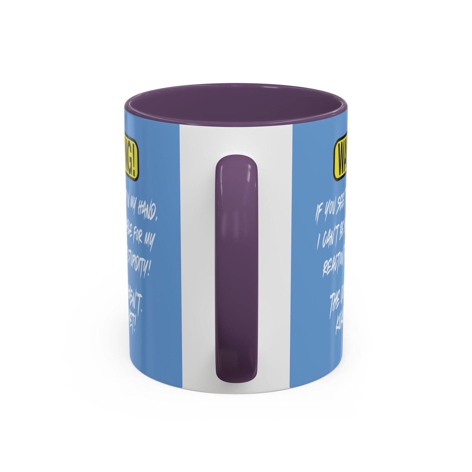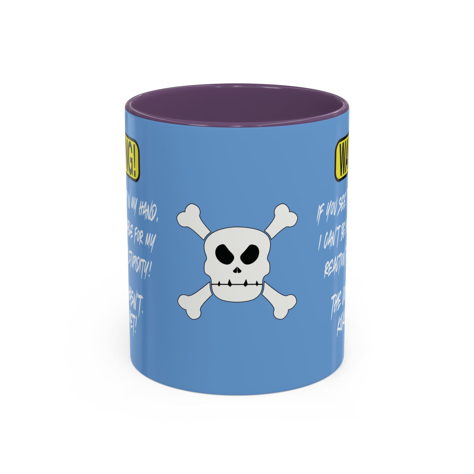 With a WARNING sign on top and the text "If you see this cup in my hand, I can't be held liable for my reaction to YOUR stupidity! The coffee hasn't kicked in yet!". If that doesn't say enough, the skull and cross bones on the front should definitely give them the memo. At that point, you've done all you can to give them notice that they may not appreciate your reactions right now, and they are proceeding at their own risk. This 11oz mug has options for 4 different accent colors, and makes a perfect gift for your family or co-workers who just aren't morning people.